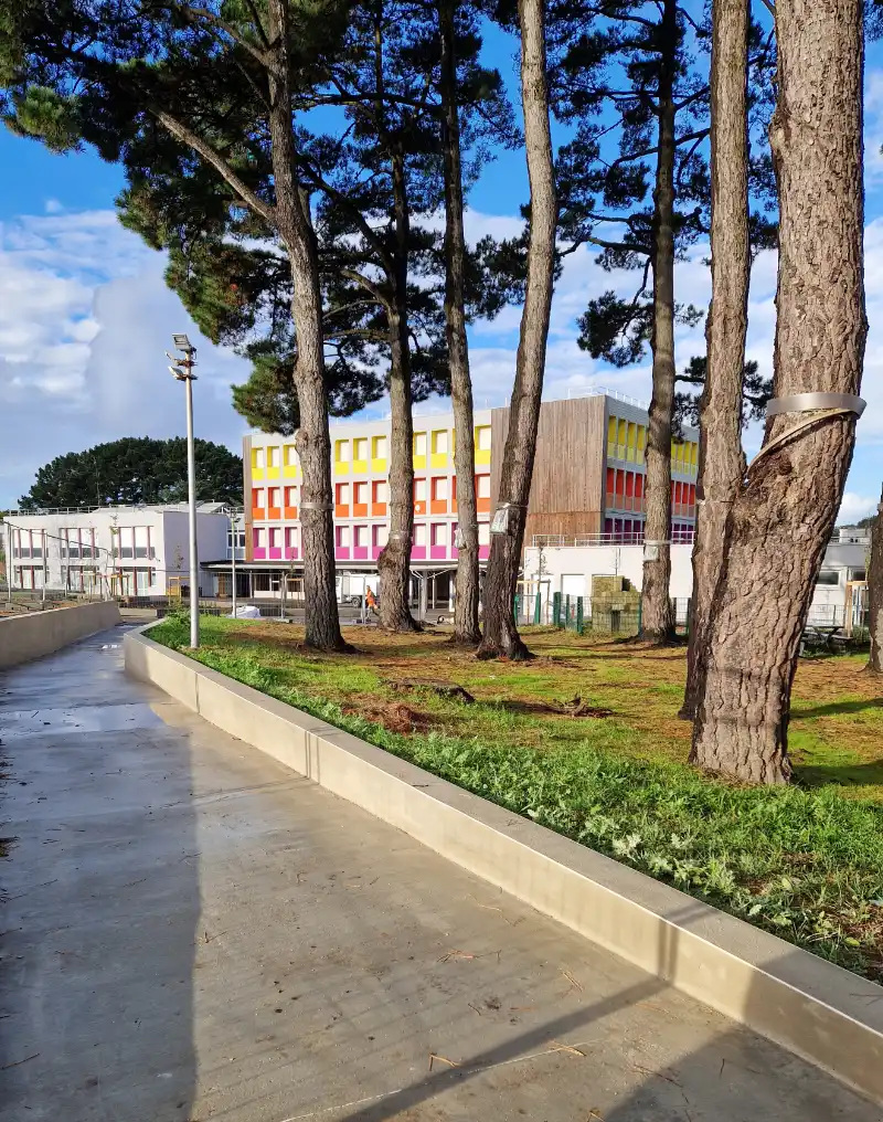 - mise aux normes de la rampe PMR située le long de la pinède, rampe essentielle pour rejoindre depuis la cour haute (accès aux bus scolaires) la cour basse, accès aux bâtimentssur la cour haute aire dédiée aux activités sportives, espace de jeux adapté aux multisports.