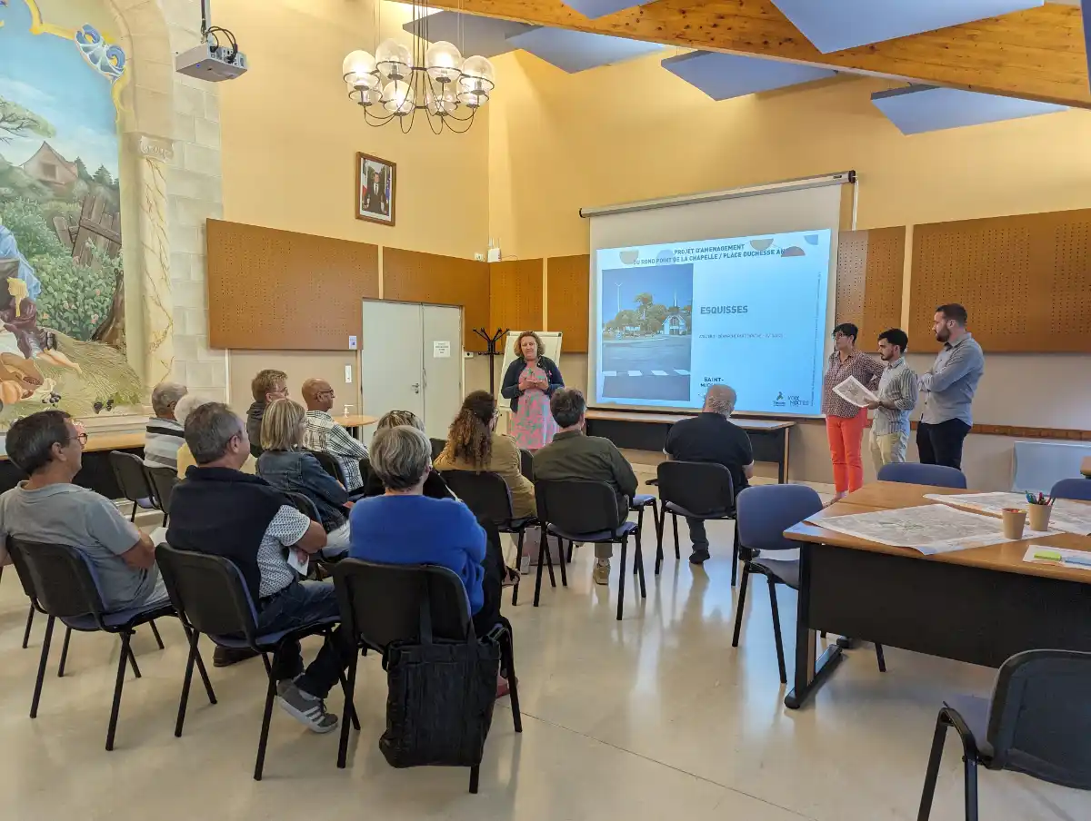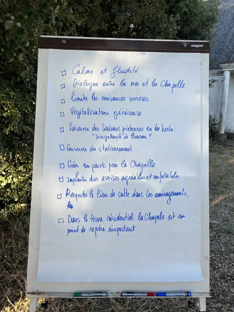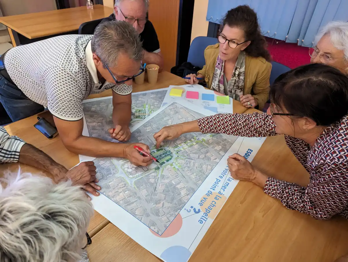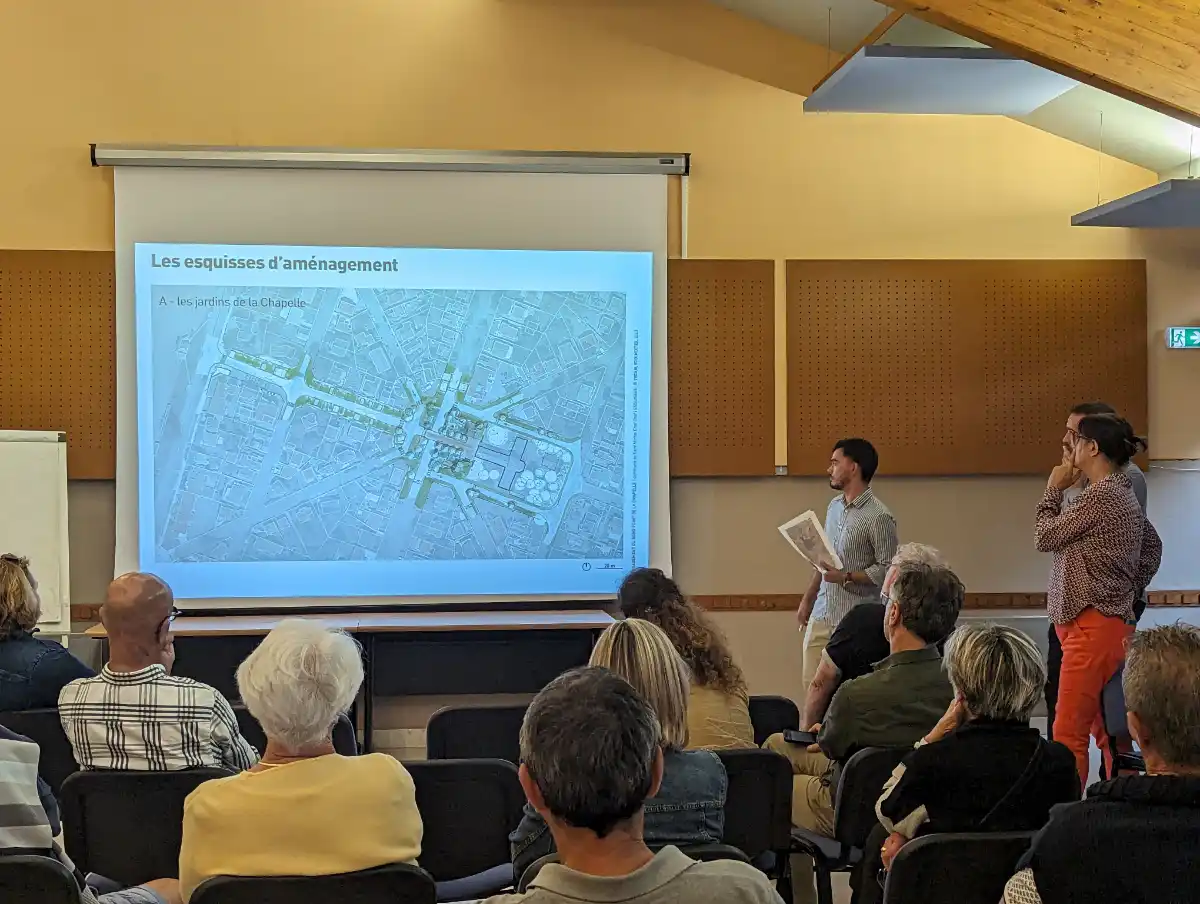 En amont, la collectivité a travaillé à l’élaboration d’un Plan Guide d’où est issue la volonté d’aménager la place de la Chapelle. Lors de ce plan de planification urbaine, une concertation auprès des citoyens a eu lieu. Notre équipe, dès le démarrage de la mission de maîtrise d’œuvre, a enclenché la suite de la démarche participative, mettant en œuvre le protocole suivant :